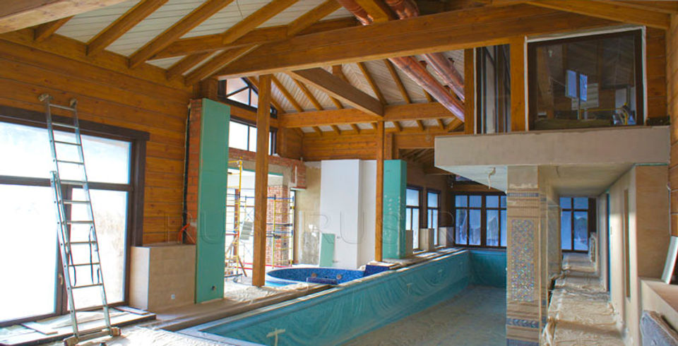 Делать бассейн внутри бани из клееного бруса кажется нам не совсем логичным. Ведь исторически, баня из бруса не имеет больших окон, а бассейн при нашем, достаточно северном климате с продолжительной зимой, должен быть светлым. Это неминуемо влечет за собой необходимость остекления больших проемов. Конструктивно большая площадь остекления не совсем гармонично сочетается со стенами, сложенными из клееного бруса. И тогда нам на помощь приходит освоенная компанией РусБрус фахверковая технология. Она позволяет достаточно экономично остеклить большие пролеты. Это делает бассейн светлым, а окружающую природу неотъемлемым элементом его интерьера при любой погоде. Наши опытные конструкторы объединят баню из клееного бруса с фахверковым бассейном в единую конструкцию, что позволит получить максимальный эффект.